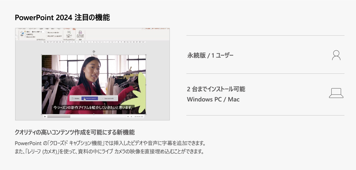 最新バージョンの PowerPoint 2024 を使用すれば、直観的にさまざまなツールを使うことができるので、効率良く作業を行い、生産性を最大限高めることができます。 クラウド ストレージである OneDrive や SharePoint Online を併用することで、複数のメンバーでプレゼンテーションで使用するスライドを作成したり、家の中だけでなく、外出中でもスマホやタブレットからスライドを確認、編集することができるため、いつでも、どこにいても、スライドを作成することができます。また、PowerPoint 2024 では、アクセシビリティの問題をワンクリックで修正したり、音声ガイドを聞きながら操作することができるなど、アクセシビリティの向上が図られており、年齢や身体の特性の有無を問わず、PowerPoint 2024 をお使いいただけます。なお、PowerPoint 2024 は、Windows PC / Mac でご使用いただけます。