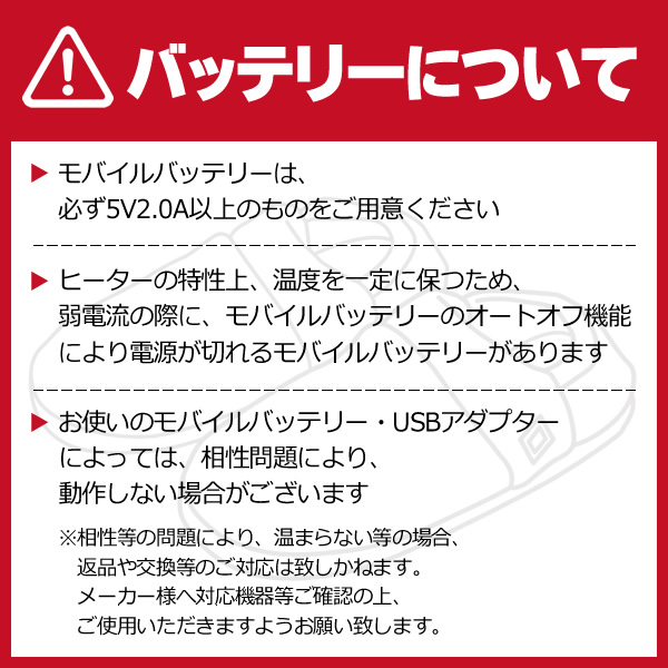 ※モバイルバッテリーは付属しておりません。 ※周囲の環境、使用するモバイルバッテリーの性能により温度・稼働時間が前後します。