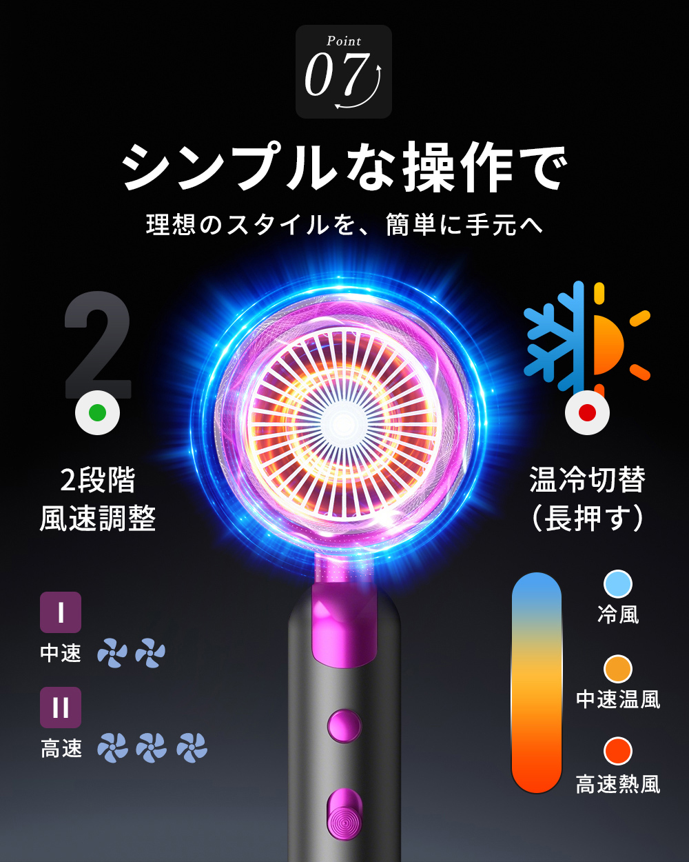 風量調整、温風・冷風もワンタッチ切替。
