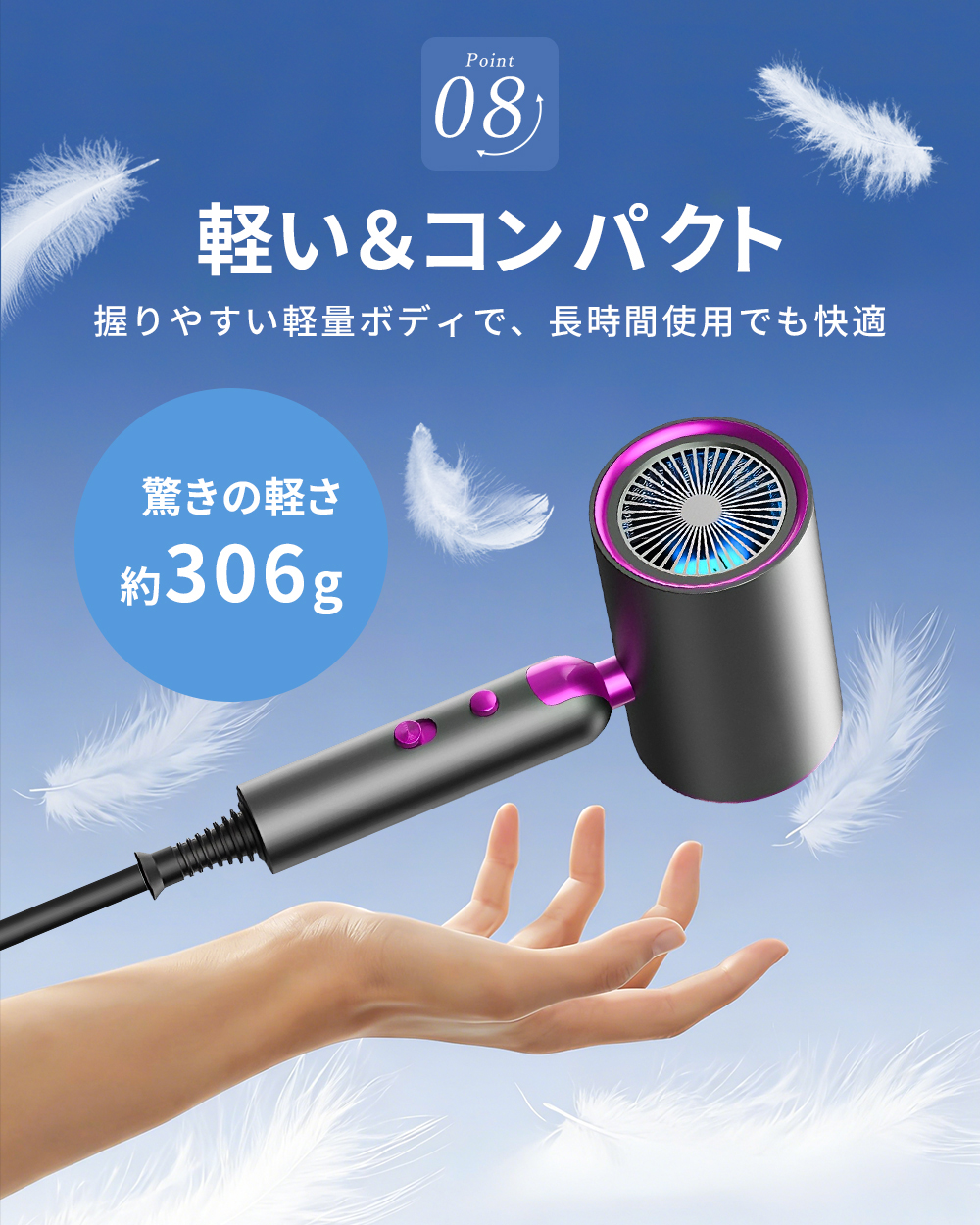 長時間使用しても腕が疲れにくい軽量設計。