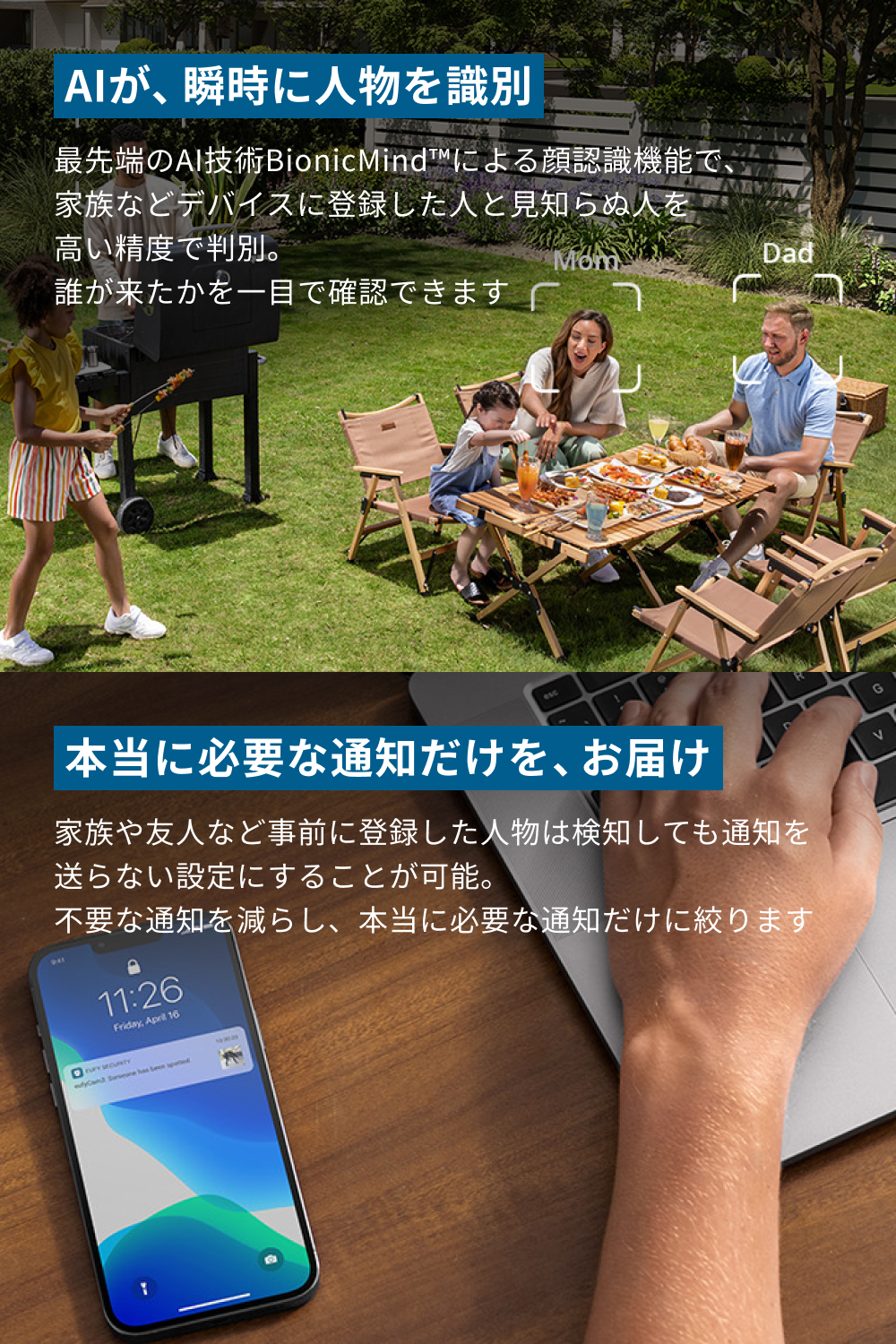顔認識AI技術により、家族などデバイスに登録した人と見知らぬ人を判別し、誰が来たかを一目で確認できます。※顔認識はクラウドでなく、HomeBase S380で処理されます。顔認識機能を使用するには、動作検知設定の検知対象に「人物(顔認識)」を有効にしてください。