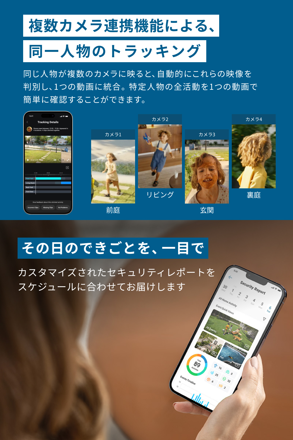同じ人物が複数のカメラに映ると、自動的でこれらの映像を判別し、1つの動画に統合。特定人物の全活動を1つの動画で簡単に確認することができます。※Eufy専用アプリで複数カメラ連携機能を有効にする必要があります