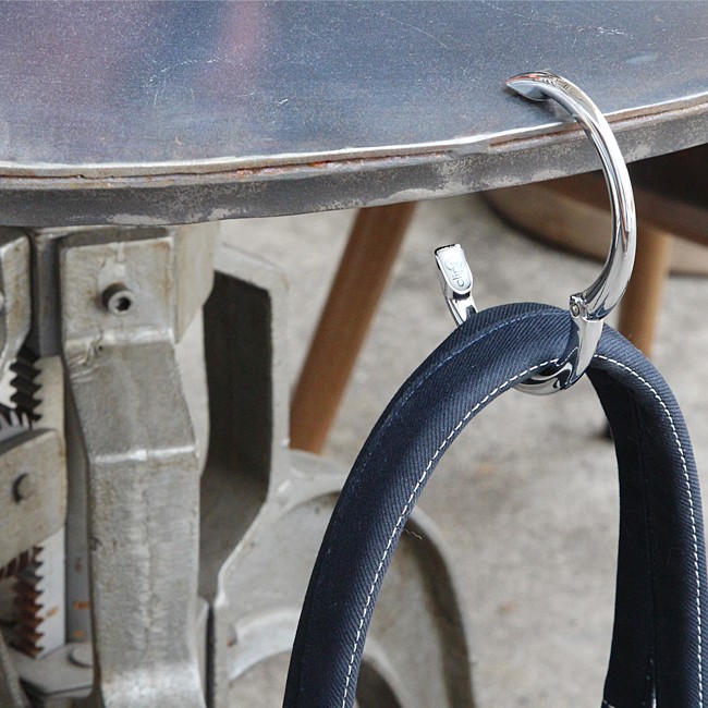 他のバッグハンガーではデザイン性、耐久性などから、どうしても使用場面が限定されていました。クリッパは特殊な形状と一般的なバッグハンガーの約10倍の耐荷重性によって、平らな平面だけではなく引っ掛ける場所があればどこでもご利用いただけます。