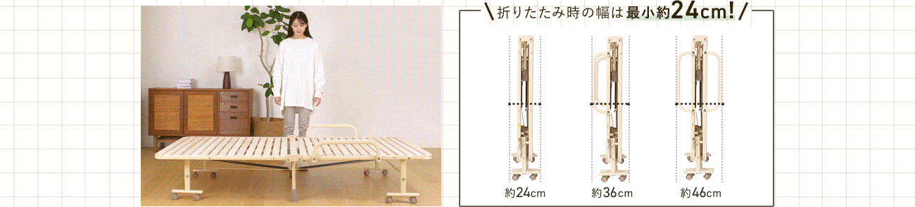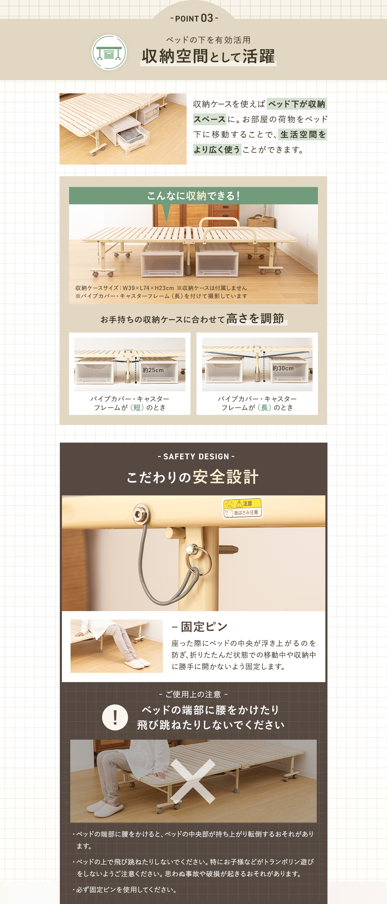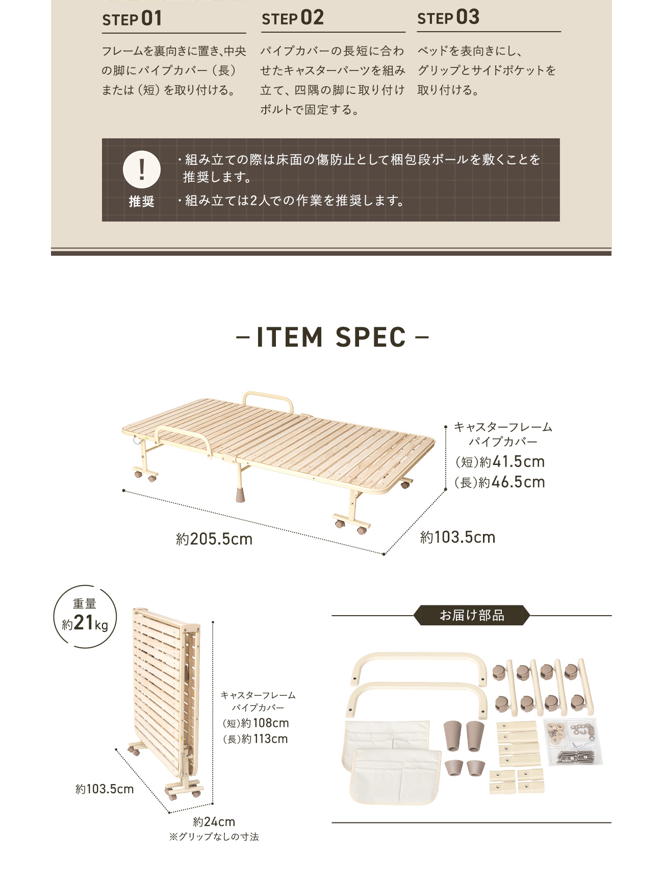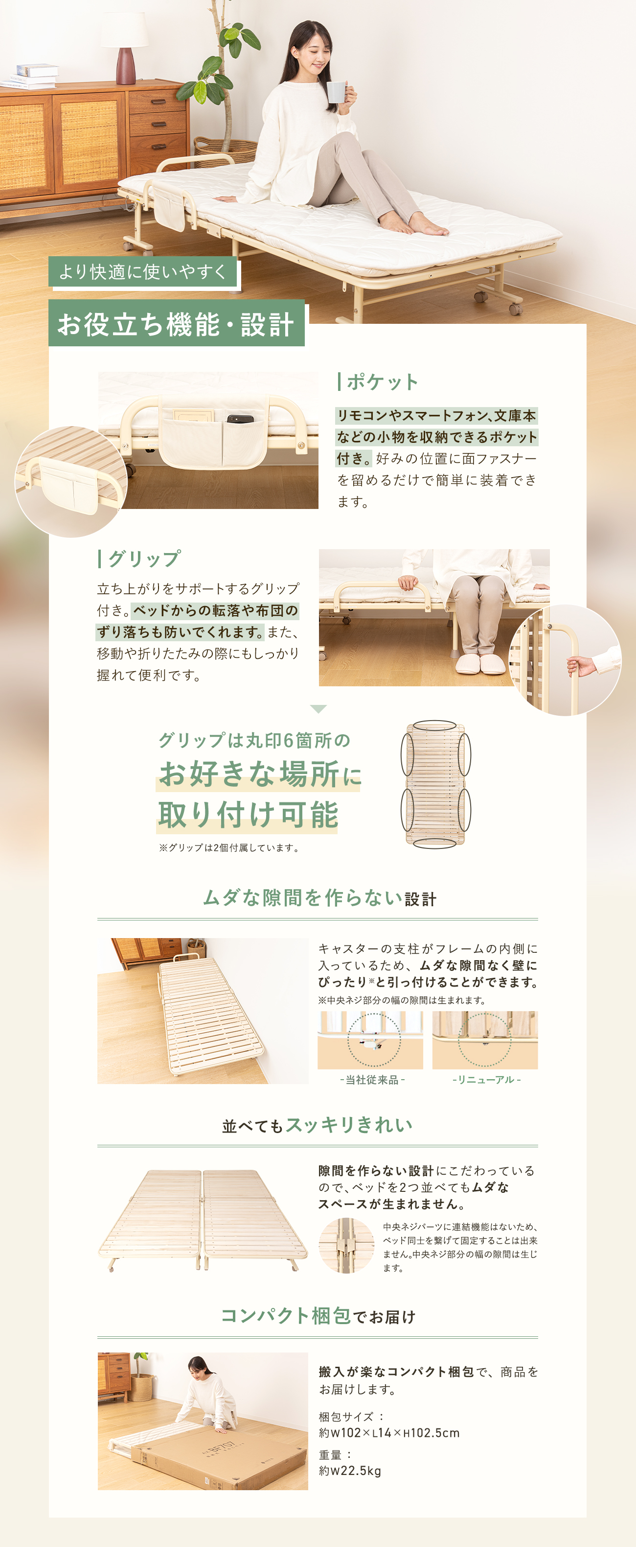 サイドポケット:ポリエステル100%(帆布) ■付属品: サイドポケット×2、グリップ×2、キャスター(ストッパー付) ■安全使用荷重: 90kg以下 ■保証期間: 1年 ■生産国: 中国 サイズ・重量 ■本体サイズ: (約)W1035※1 × L2055※2 × H415 / 465mm ■収納時サイズ: (約)W1035※1 × L460※2 × H1080 / 1130mm ■床フレーム高さ: (約)305 / 355mm ■重量: 約21kg 梱包仕様 ■個装箱: (約)W1,020×L140×1,025mm / 約22.5kg 関連キーワード