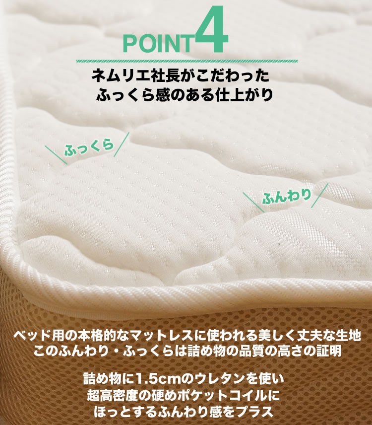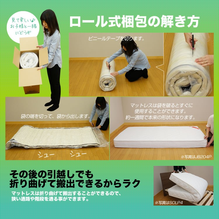 【注意】マットレスの上に立ったり飛び跳ねたりすることは、布地やスプリング・詰め物の破損、へたりの原因になりますのでおやめ下さい。