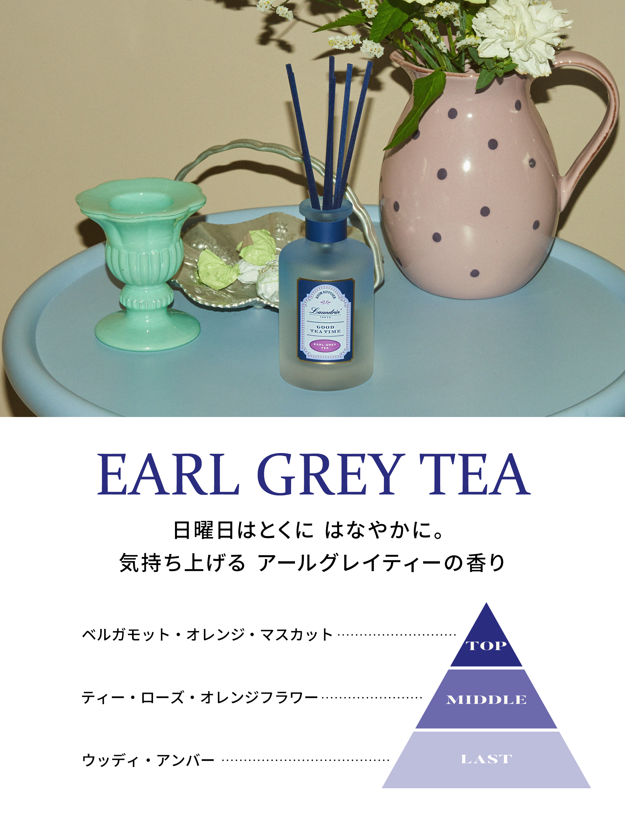 いつもの時間がもっと楽しくなるティーフレグランスシリーズ、アールグレイティーの香り。フレーバーティーならではの華やかさと透明感のある香りです。