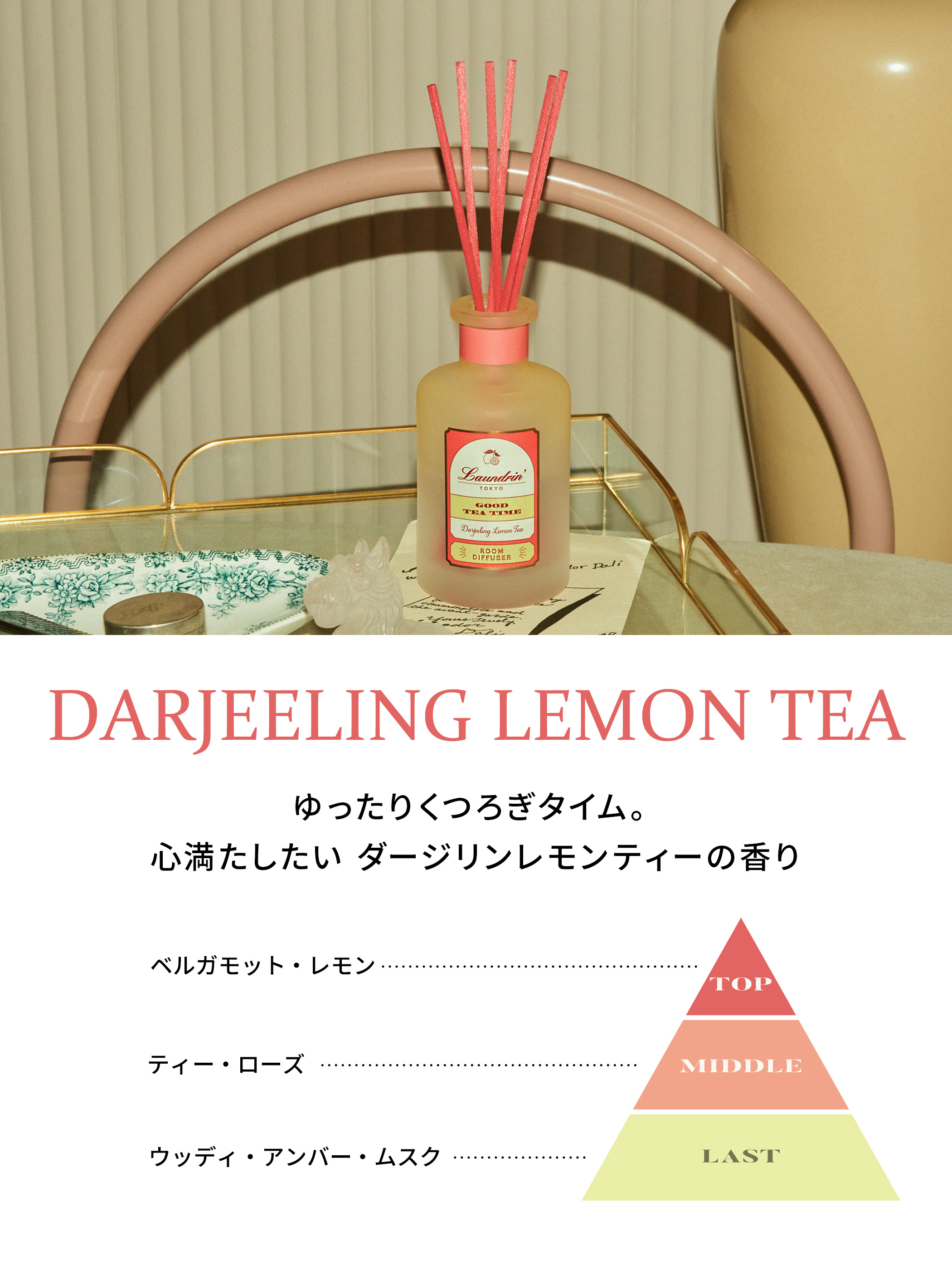 いつもの時間がもっと楽しくなるティーフレグランスシリーズ、ダージリンレモンティーの香り。芳醇なダージリンにシトラスが重なる爽やかな香りです。