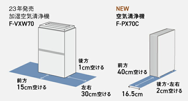 ※1 【比較条件】当社同風量帯における機種での設置制約スペースとの比較。【設置制約スペース】23年発売F-VXW70 4,162cm2、25年発売F-PX70C 1,320cm2