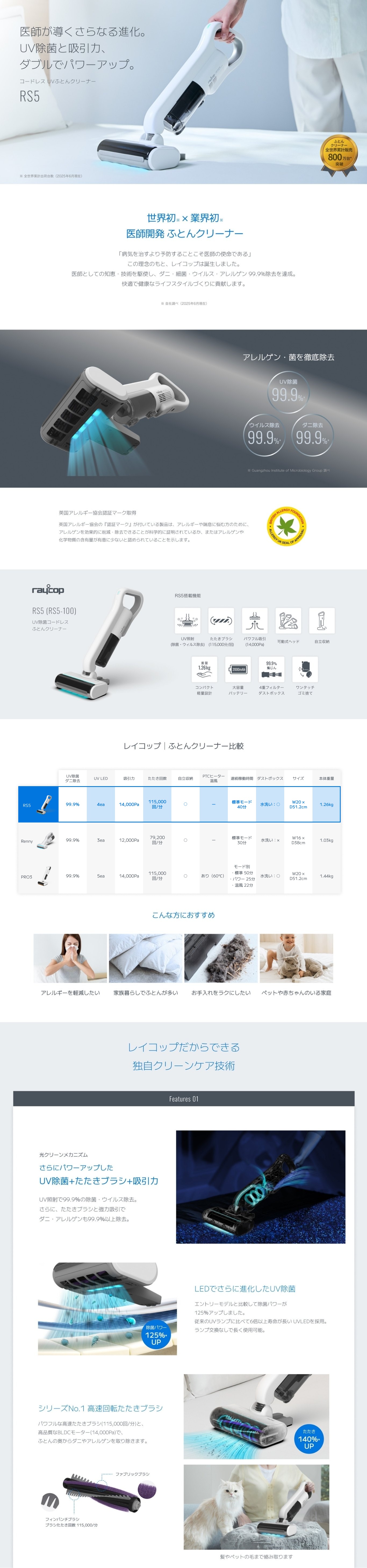レイコップ 布団クリーナー コードレス 新型 UV除菌 ダニ 軽量 医師開発 ふとん掃除機 LED 除菌 バッテリー長持ち RS5-100