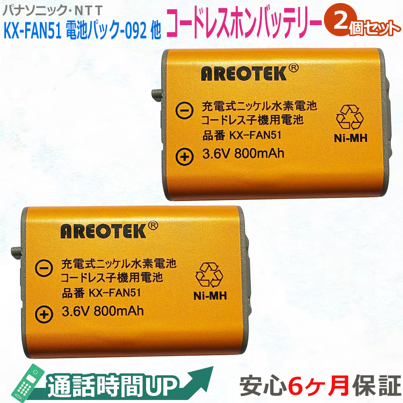 KX-FAN51(2個セット)PANASONIC コードレスホン子機用電池 HHR-T407 NTT電池パック-092 TSA-124 TEL-B2078H 【純正品と完全互換 】