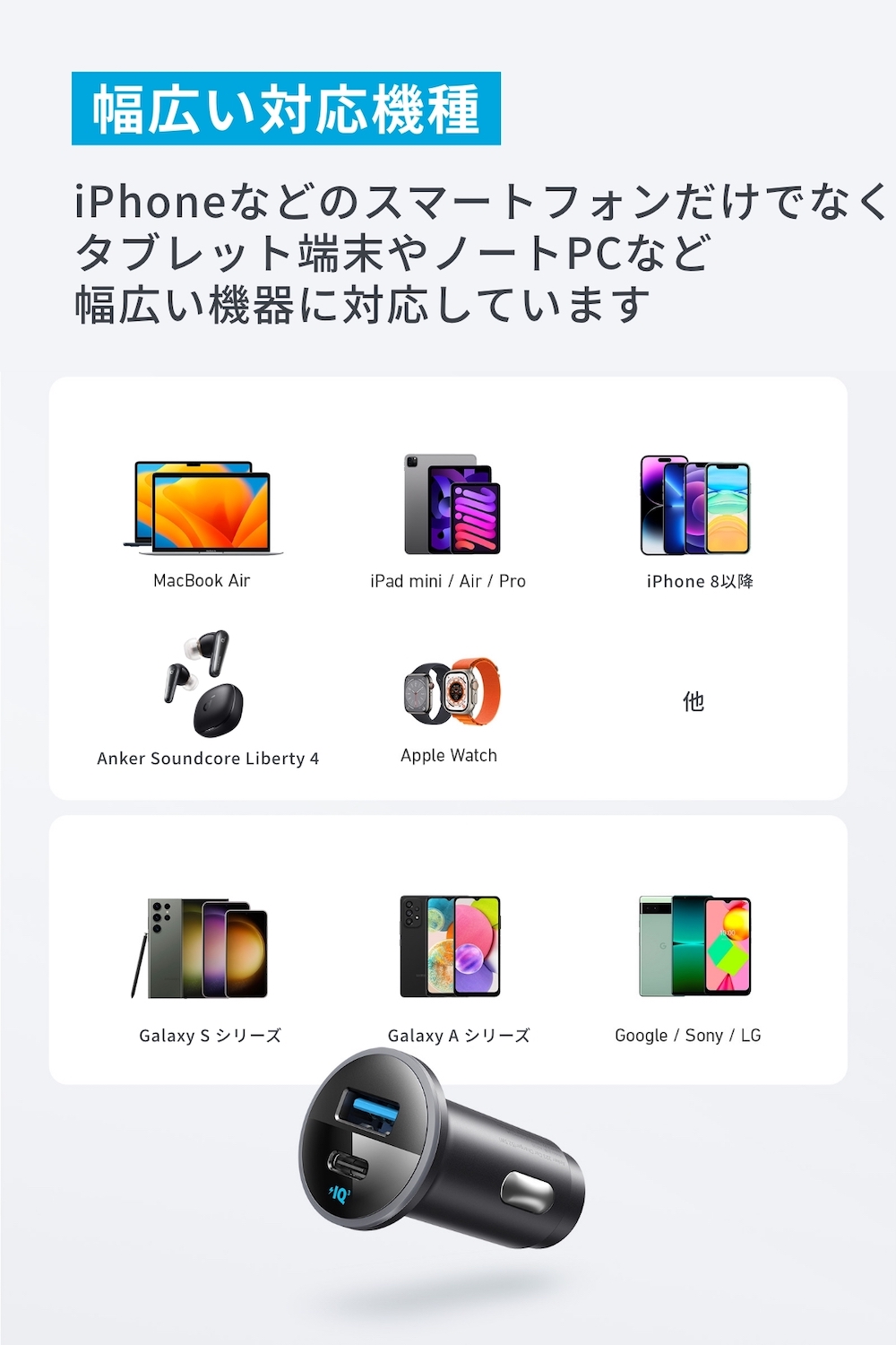 ・パッケージ内容:Anker 323 Car Charger (52.5W) 、USB-C & USB-Cケーブル (1.0m)、取扱説明書、最大24ヶ月保証 (※正規販売店からの注文に限り18ヶ月保証の対象となり、条件付きで+6ヶ月の延長保証が付きます。注文番号が保証書の代わりとなります。) 、カスタマーサポート