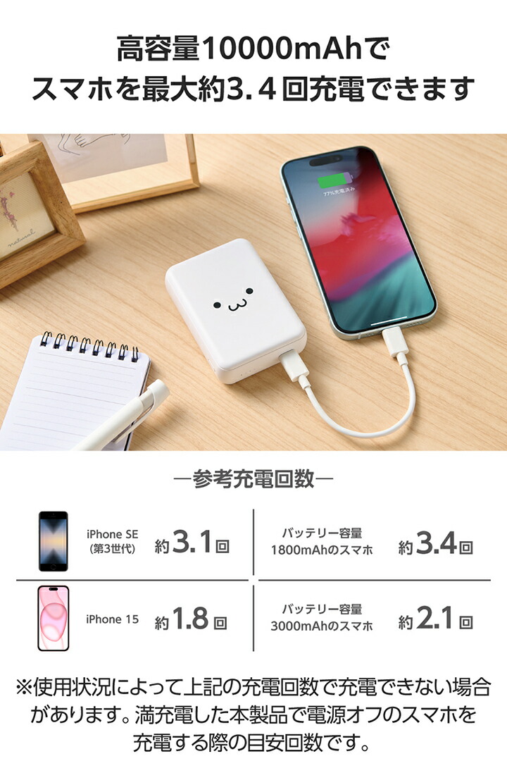 ■本製品(バッテリー容量10000mAh)で、1800mAhのスマートフォンを約3.4回、3000mAhのスマートフォンを約2.1回充電可能です。