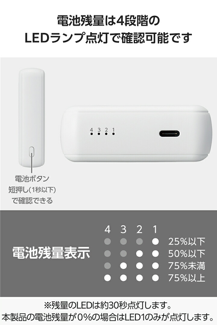 ■電池残量は4段階のLEDランプ点灯で確認可能です。