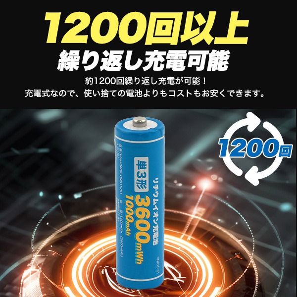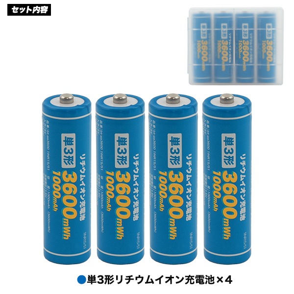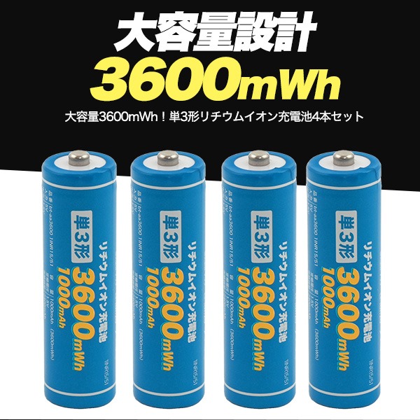 大容量3600mWh!単3形リチウムイオン充電池4本セット!