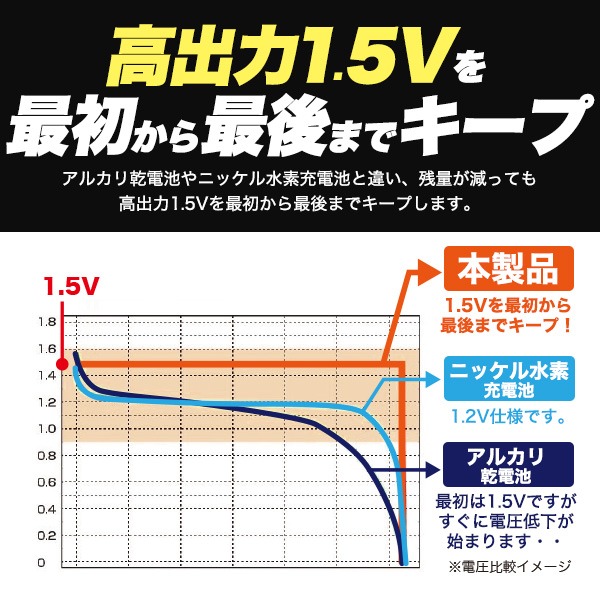 アルカリ乾電池やニッケル水素充電池と違い、残量が減っても高出力1.5Vを最初から最後までキープ!