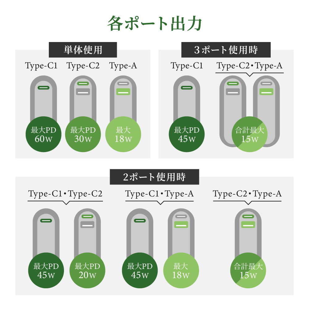 USB Type-C1 + USB Type-C2 + USB Type-A :PD45W(USB Type-C1)+Total 15W(USB Type-C2 + USB Type-A)