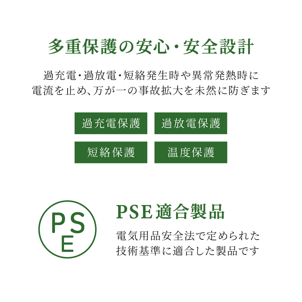過充電(電圧/電流)保護、過放電(電圧/電流)保護、短絡(ショート)保護、温度保護