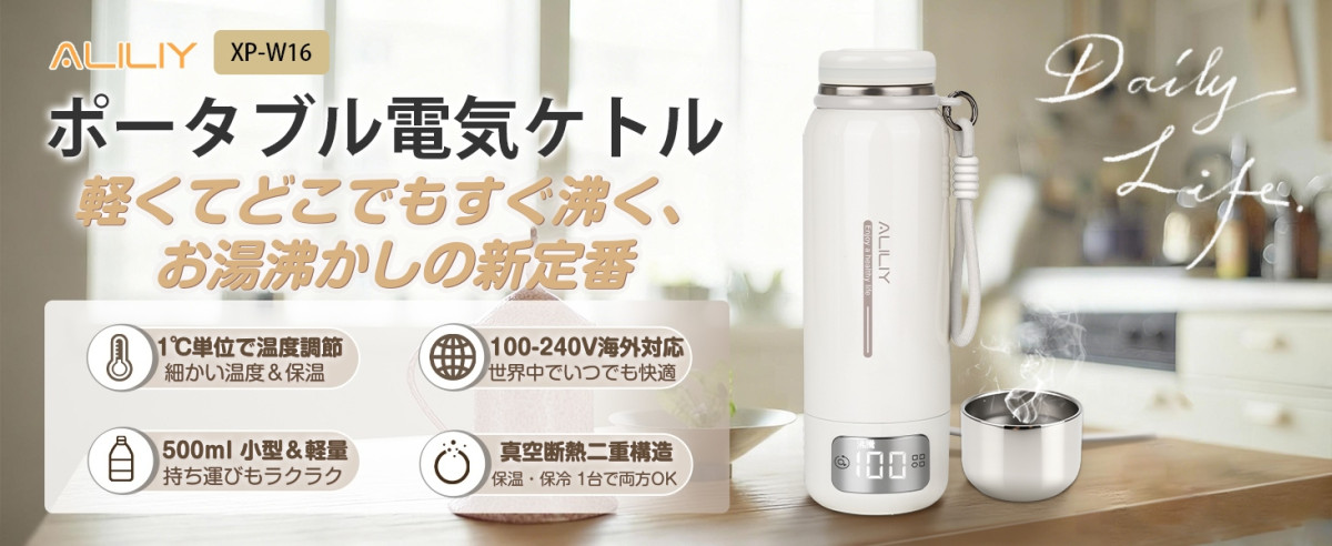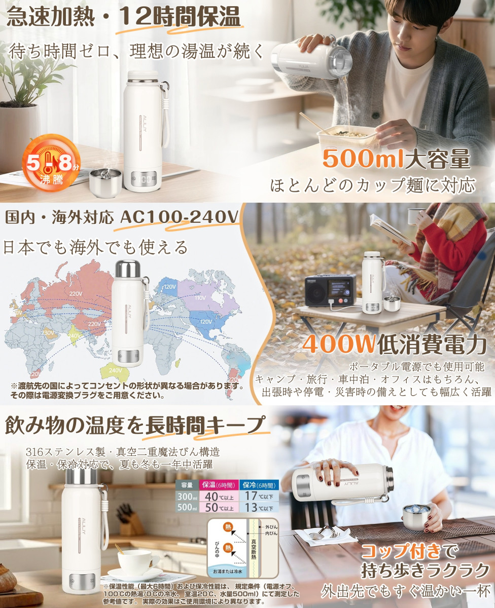電気ケトル ポータブル 真空断熱構造 保温保冷 316ステンレス トラベルケトル 500ml容量 100-240V対応 温度調節 持ち運びケトル 400W 小型 一人暮らし
